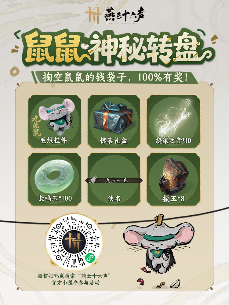 同时另有大鹅来报,近日小程序有鼠鼠出没,企图获取游侠们的鹅毛。大鹅已努力驱赶,但不免有漏网之鼠,请各位游侠保持警惕!另外大鹅从鼠鼠兜里掏出了不少好东西,放进了【鼠鼠神秘转盘】,包括九流鼠毛绒挂件、【九流一毛】纪念侠名、绕梁之音*10等等,每一抽都有奖!