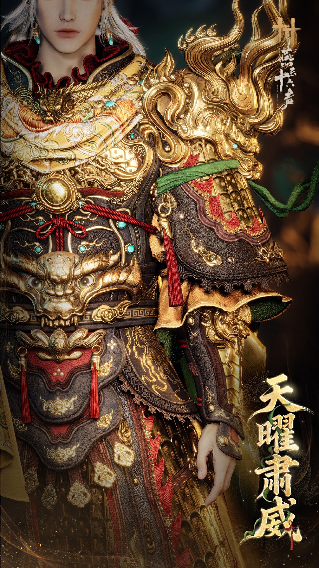 黄袍贴身为里,是这一身威仪最根底的气魄。盘龙胸甲周匝环绕,龙身紧缠、鳞片分明,整条苍龙似被锻进金铁之中,永世盘踞于胸前。猩红长绳自胸口处一圈圈勒紧,在金甲与黄袍之间束出利落的轮廓——是武人骨子里的凌厉,半分不肯松懈。