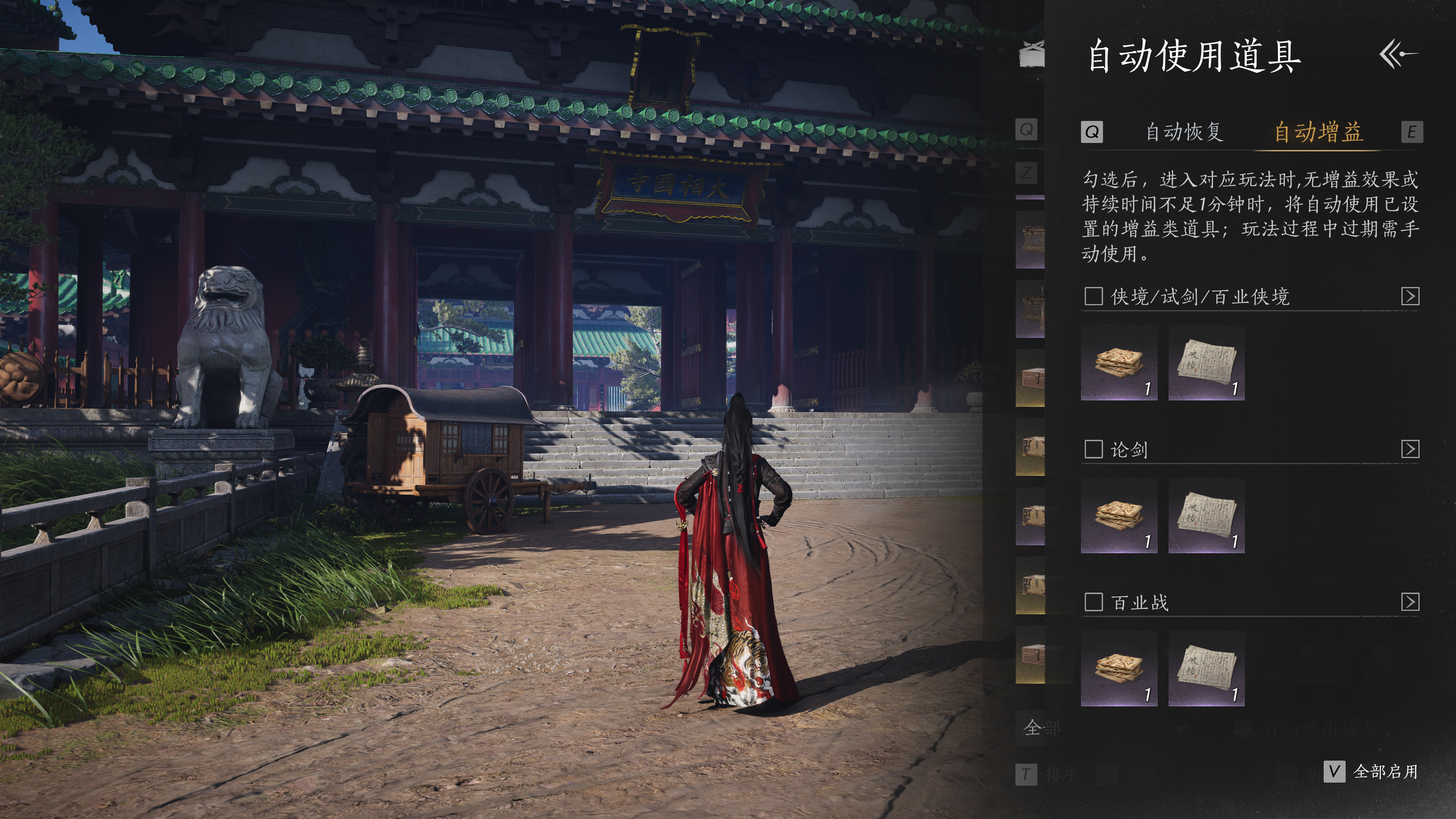 为了让游侠战斗时使用道具更便捷,本次更新新增「自动使用增益道具」功能。游侠们可针对侠境、止戈、百业战等各种玩法,设置自动使用的「增益食物」及「增益符」。各个玩法支持独立设置不同的使用方案,也支持游侠自由选择是否自动使用。